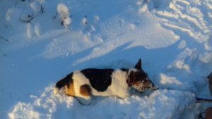 Büszkén kocogott a rejtekhelyhez, és hozta nekem a csont keményre fagyott – azokban a napokban éjjelente bizony -15 fok is volt- merev egeret. Akkor és ott megvilágosodtam. A teraszunkon is volt vagy fél méter magas hó. Ha hazaértünk, beássuk a zsákot!