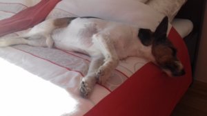 Spy ezúttal egy őz alsó állkapcsát találta meg. Abban is volt még némi rágcsálnivaló, amolyan fogíny maradék. Azt is megcsócsálta kicsit. Spyke igazán nem válogatós, csak és kizárólag otthon.