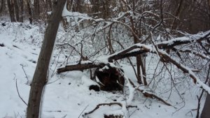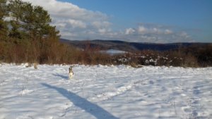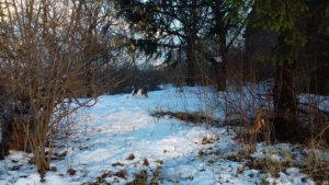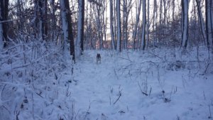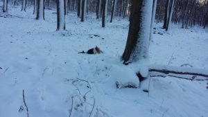 Ha már nagy vadat nem láttunk, Spy lelkesen nekiállt ásni. Két dologból nem tudom kizökkenteni soha, az ásásból, és abból, ha valamit – macska, mókus, stb.- felkerget egy fára. Leültem egy magaslesre, és hagytam had tegye a dolgát a kis PRT. Néma csendben voltam, és élveztem a telet, a hideget, és a tájat. Ábrándozásomból az zökkentett ki, hogy a nap már lemenőben volt. Biztosan sokan láttátok már, amikor a lemenő nap rózsaszínre fest mindet. Mi még félúton voltunk, és mivel télen hamar sötétedik, úgy gondoltam rövidítünk. Nem a földúton megyünk vissza, hanem átvágunk a kiserdőn.