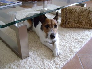 Miután hazaértünk, Spy nagy vidáman, beügetett a szobába. Egyenesen a dohányzóasztal alá vonult.