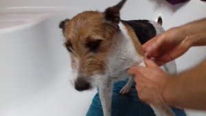 Kezelőnél, egyébként a kis szó azt jelenti, hogy a kutya tocsog a lötyiben. Mert értem én, hogy 10 kg alá és fölé van dozírozva a készítmény, de amint átlépi a bűvös határt a kutya testtömege, egészen pontosan 10,1 kg-ra ugrik a mérleg mutatója, a jó doktor már nyúl is a nagyobb adaghoz. Nem baj, hogy rajta van a kis PRT-n a nyakörv, nem baj, hogy a reggeli szükségletei elvégzése előtt, nyitásra jöttünk. A 10 kg, az 10kg. Szigorúan. Az sem tartja vissza, hogy összesen nincs annyi testfelülete a kutyának, ahol ennyi folyadékot, el lehet rendesen oszlatni. Egy border collie-ra szánt mennyiséget használunk a kis PRT-re. Érthető tehát, hogy a művelet végére Spyke, úszik a lében. Én pedig a boldogságban.
